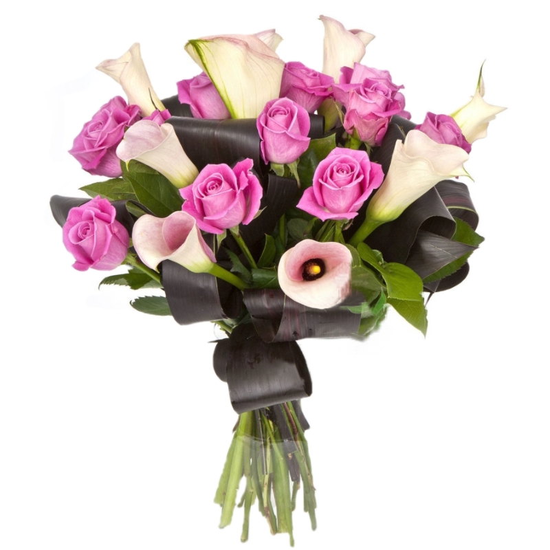 Букет состоит из 11 розовых роз, 8 калл, аспидистра, прозрачная упаковка, атласная лента.
